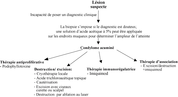 GestionPour la majorité des patients, le traitement va pouvoir procurer des périodes exemptes de verrues. Non traitées, les verrues peuvent disparaître d’elles-mêmes, ne pas évoluer ou augmenter en taille ou en nombre. Un traitement peut diminuer mais non éliminer une infection au VPH. Rien ne suggère définitivement qu’aucun des traitements disponibles n’est supérieur aux autres et aucun traitement n’est idéal pour tous les patients ou toutes les verrues. La majorité des patients a besoin de cycles de traitements - plutôt que d’un traitement unique - et l’amélioration survient généralement en dedans de trois mois lorsqu’ils sont administrés par un professionnel en soins de santé. [Centers for Disease Control. Genital Warts Treatment Guidelines 2006. [URL : http://www.cdc.gov/std/teatment/2006/genital-warts.htm.] Avant d’entreprendre un traitement quelconque des verrues génitales, il est indispensable de dépister chez les patients s’il y a présence d’autres maladies transmissibles sexuellement. La majorité des modalités de traitements s’attaque au symptôme de la maladie (les verrues) et non à la cause de la maladie elle-même. Cependant, l’imiquimod va plus loin en stimulant une réponse immunitaire, ce qui conduit à une attaque sur les verrues visibles ainsi que sur le virus qui demeure dans la peau d’apparence saine autour des verrues. Il agit donc dans le VPH clinique et subclinique. Quatre modalités de traitements