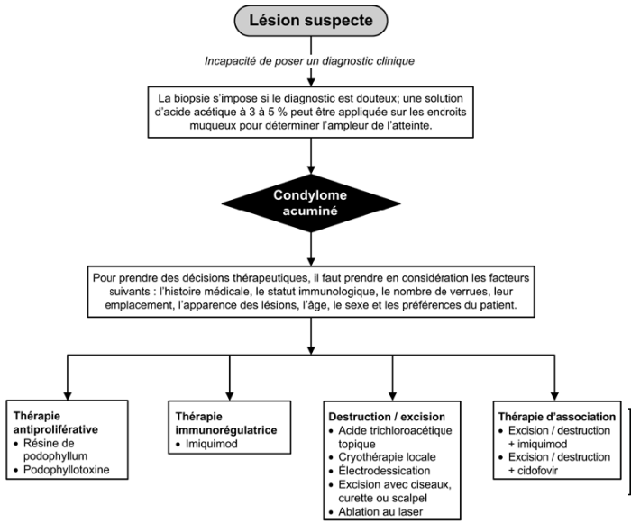 Le condylome acuminé (verrues génitales ou vénériennes) constitue un important souci de santé, particulièrement parmi les jeunes adultes. Considérées comme étant une des formes les plus courantes de maladies transmises sexuellement (MTS), les verrues génitales externes sont causées par une infection par le virus du papillome humain (VPH), le même virus qui cause la majorité des cancers du col de l’utérus. Des progrès thérapeutiques relativement récents incluent un immunorégulateur et un vaccin prophylactique qui ont considérablement élargi les options pour leur gestion. Nous étudierons ici les thérapies conventionnelles et les plus récentes.