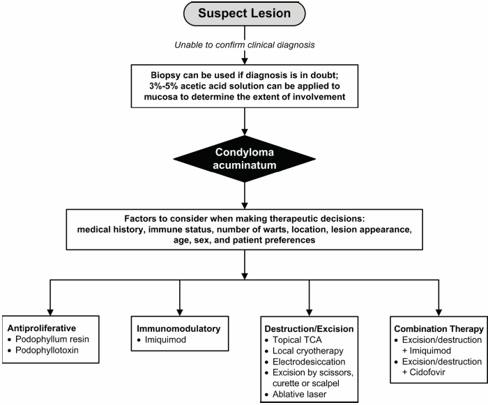 - Therapeutic decisions should be guided by wart type, location, number, sex, patient preferences, physician experience,and unique circumstances (e.g., young age, immunosuppression, pregnancy).